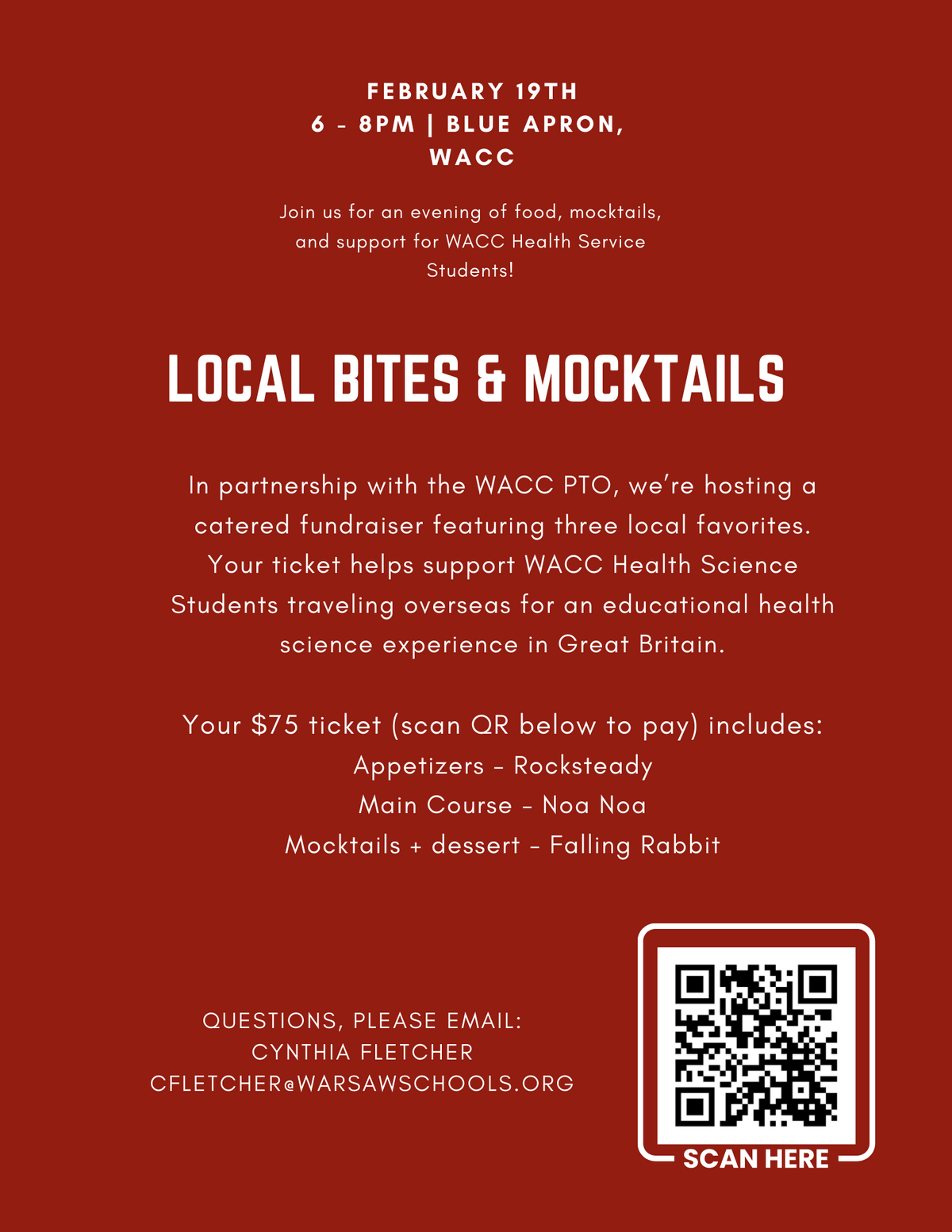 Join us for an evening of great food and an even greater cause! In partnership with the WACC PTO, we’re hosting a catered fundraiser to support WACC Health Science students who will be traveling overseas for an educational experience in Great Britain.